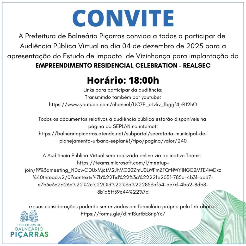 A Prefeitura de Balneário Piçarras, por meio da Secretaria de Planejamento, realiza audiência pública virtual para apresentação do Estudo de Impacto de Vizinhança (EIV) para implantação do Residencial Multifamiliar Vertical – Celebration – Realsec, no dia 04 de dezembro, às 18h. A audiência pública será transmitida pelo aplicativo Teams e pelo youtube da Secretaria de Planejamento.