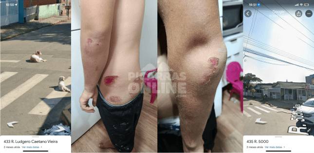 “Meu filho estava voltando do almoço, indo trabalhar, quando um cachorro passou na frente da moto, ocasionando um acidente. Essa cadela tinha tutor, ele é dono do bar ali. Queria deixar meu relato e indignação. O mesmo não prestou socorro ao meu filho, que se acidentou por conta da falta de cuidado deles com seus cães. Fomos lá conversar com esse senhor pra ver sobre o estragos da moto, o qual se recusou a prestar suas devidas obrigações, já que é lei o tutor ressarcir o dano causado. Mas não tem problema, porque ainda temos a Justiça pra isso. Porém, eles têm outro cachorro que também fica solto e, quando estávamos saindo de lá cobrar dele, esse cachorro passou no meio do trânsito, quase ocasionando outro acidente. E eles alegam que os cachorros ‘fogem’, mas se qualquer pessoa puxar no mapa o endereço desse bar, está lá a foto dos cães no meio da rua”, relatou a mulher.