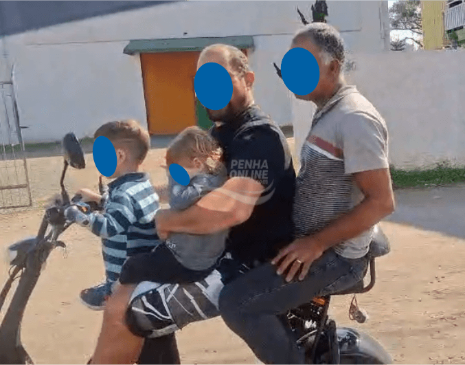 Uma cena flagrada na Avenida Nereu Ramos, em Penha, e na Rodovia Paulo Stuart Wright (SC-414 / Variante) deixou um motorista apreensivo em função do risco ao qual duas crianças estavam sendo colocadas. O condutor de uma scooter elétrica, além de transportar um passageiro – o que é permitido pelo Código de Trânsito Brasileiro – levava ainda duas crianças, que evidentemente não poderiam se proteger em caso de queda. Os meninos aparentam idades entre 2 e 3 anos, e não usavam sequer capacetes.